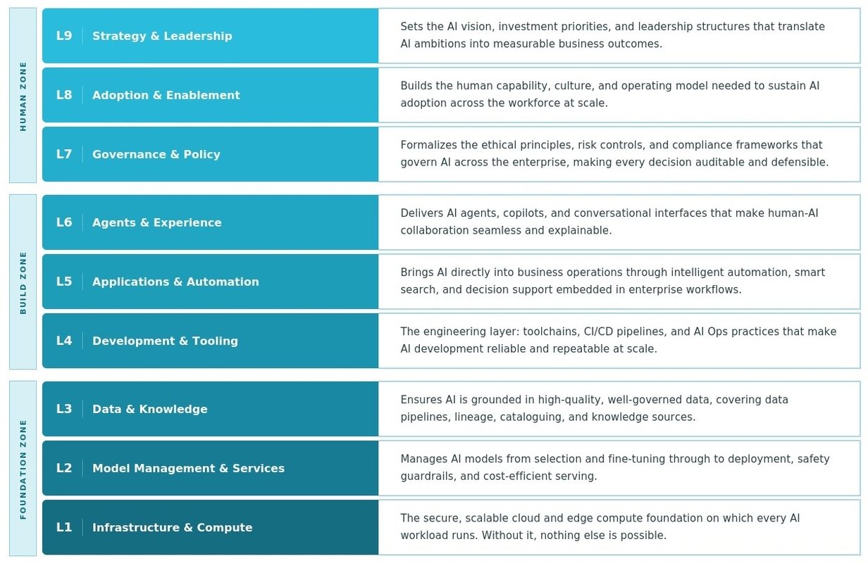 It is twelve multiple-choice questions and takes five minutes to complete. It is based on our SoT AI Enterprise Reference Model, a nine-layer framework that maps every dimension of AI capability an organization needs to deliver sustained business value.