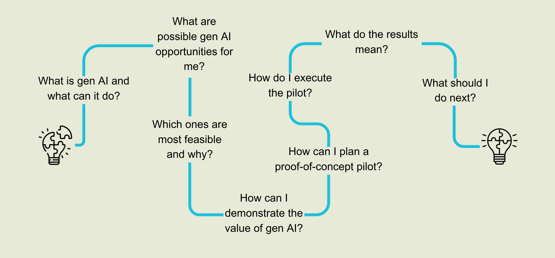 - Start small and drive quick wins: We focus on quick, low-cost pilots that address well-defined problems. These pilot projects deliver proof of value, helping you build capability and confidence in generative AI while managing risk.