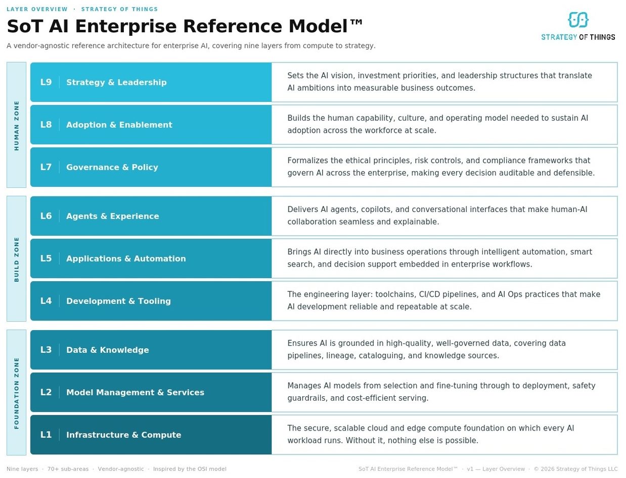 Introducing the SoT AI Enterprise Reference Model: an enterprise AI framework covering nine layers from infrastructure to strategy.