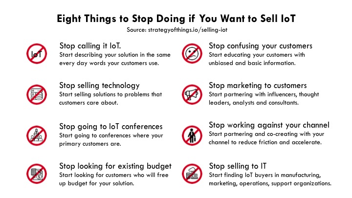 In this emerging market, what can IoT solution vendors do to sell more? This post describes eight things vendors should stop doing, along with eight things that they should be doing.
