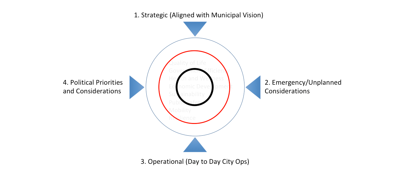 The political dimension considers how the benefits are aligned with the long term and day-to-day electoral, governance and legislative needs of the city. It reflects the priorities of the political leaders and the citizens who elected them. These priorities may not always align with the city’s strategic and operational priorities. At other times, they may be consistent with the city’s strategic priorities, but not aligned on when they should be implemented. These priorities are typically documented in the campaign platform or promises that political leaders got elected on, and addresses the specific needs of their constituents.