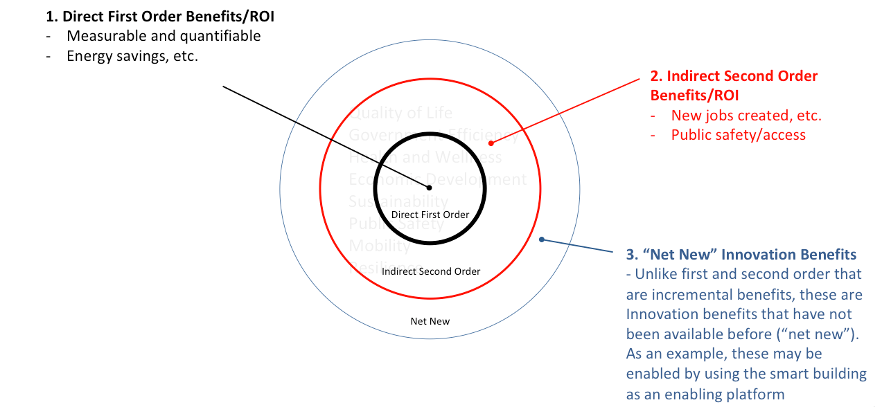 When selling the value and ROI of smart buildings to municipalities, one must understand not only what direct, indirect, and innovation benefits are offered to the city, but also how these benefits are aligned to the four civic dimensions.