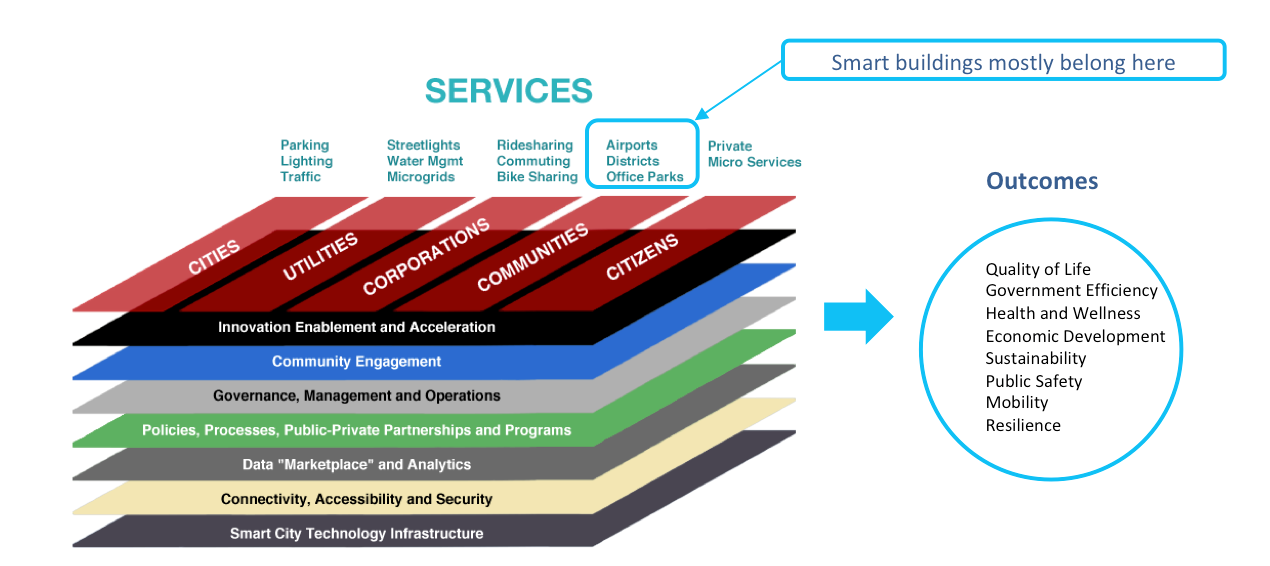 In the Strategy of Things civic ecosystem model, the smart building is an outcome provider to the city. In order to be relevant to the city, smart buildings must create those outcomes that cities care about, and to do it in ways not possible before, or with less cost, greater efficiency, and less resources.